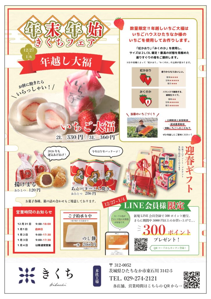 今年もいちごの季節到来!地元「いちごハウスひたちなか」様の完熟いちごを贅沢に使った、究極のいちご大福を数量限定で販売します。初物ならではの贅沢を楽しみください。